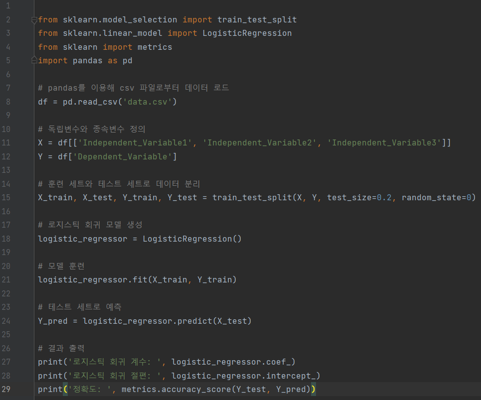 [Step 4] 모델 학습 : 데이터를 훈련 세트와 테스트 세트로 분리한 후, 훈련 세트를 사용하여 로지스틱 회귀 모델을 학습시킵니다.