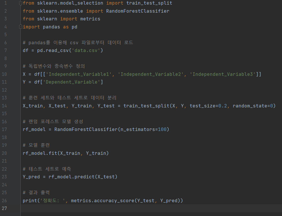 [Step 4] 모델 학습 - 데이터를 훈련 세트와 테스트 세트로 분리한 후, 훈련 세트를 사용하여 랜덤 포레스트 모델을 학습시킵니다.