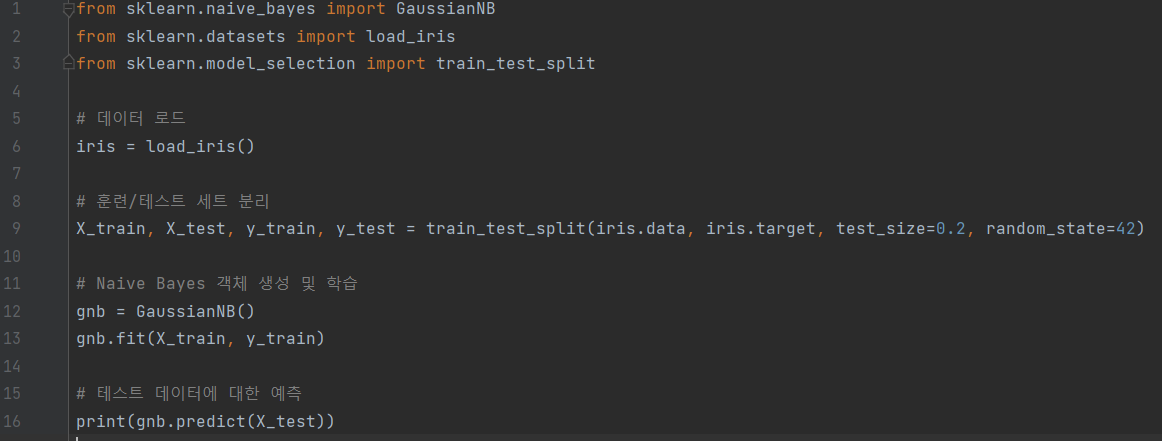 아래 코드는 sklearn라이브러리를 이용한 나이브베이즈 분석 예제 코드입니다. 해당 코드는 sklearn의 GaussianNB를 사용하여 iris 데이터셋에 대해 나이브 베이즈 분류를 수행합니다.