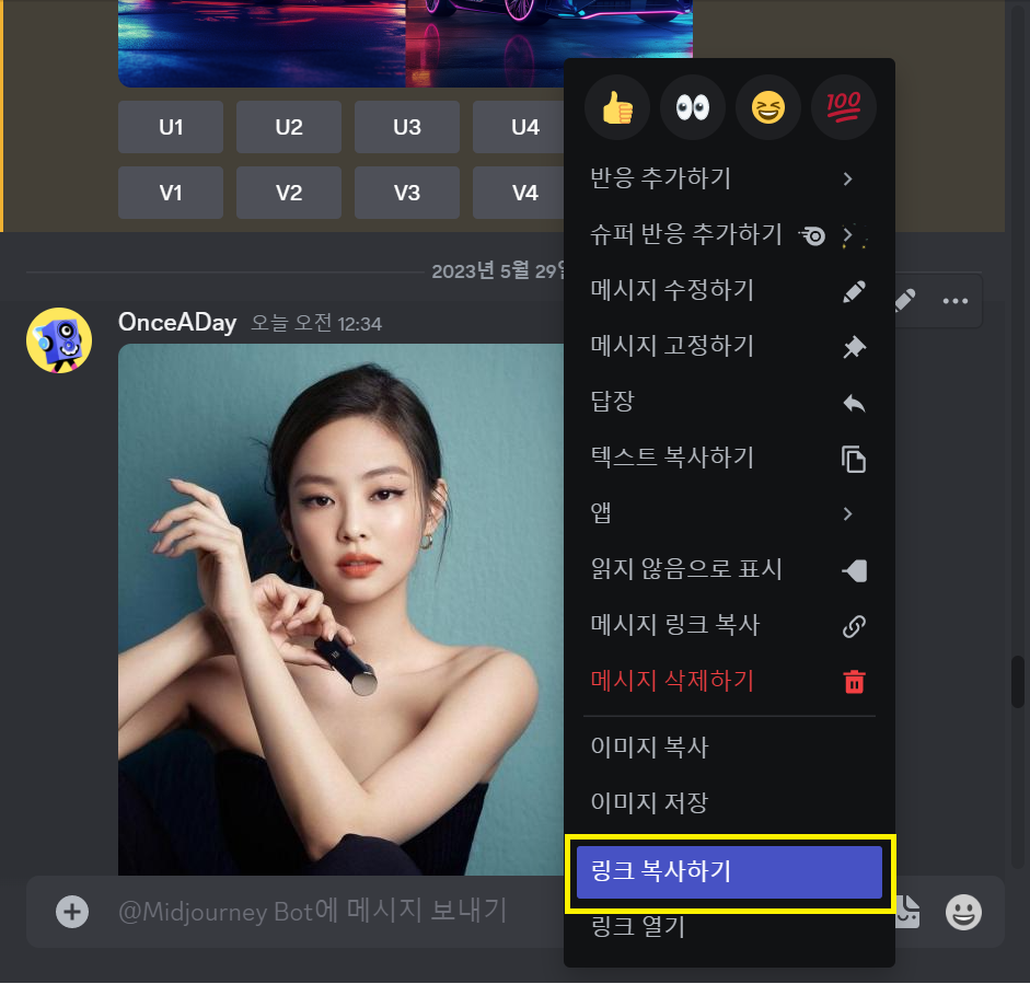 위 두 방법으로 업로드를 한 결과 아래와 같은 제니님의 이미지가 디스코드 서버에 업로드 되었습니다.