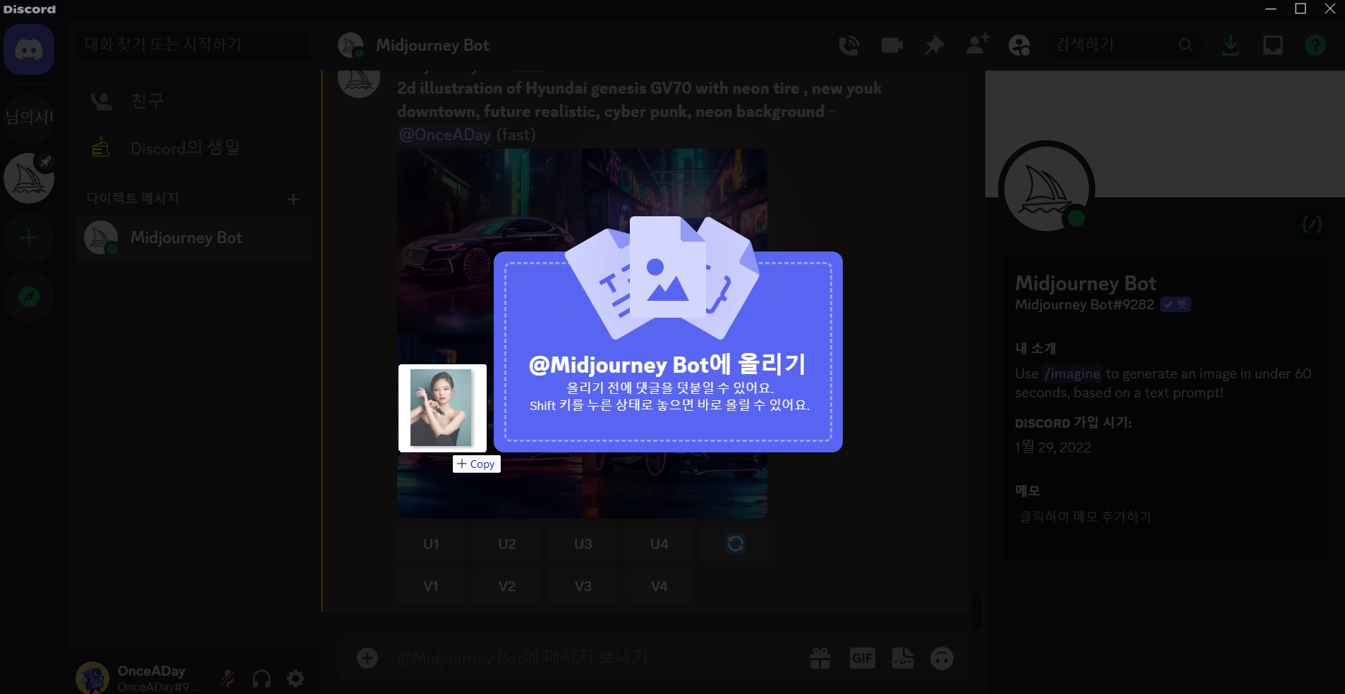 내가 원하는 사진을 미드저니 (Midjourney)를 통해 새로운 이미지로 재해석하기 위해서 사진을 디스코드 (Discord) 서버에 업로드 사용합니다. (설명을 위해 블랙 핑크 제니님의 이미지(출처 : 제니님 인스타그램)를 이용합니다.) 디스코드 서버에 업로드는 Drag & Drop 또는 이미지 업로드 버튼을 이용하여 진행합니다.
