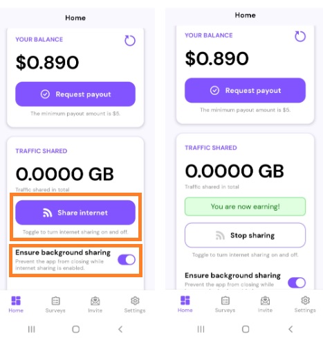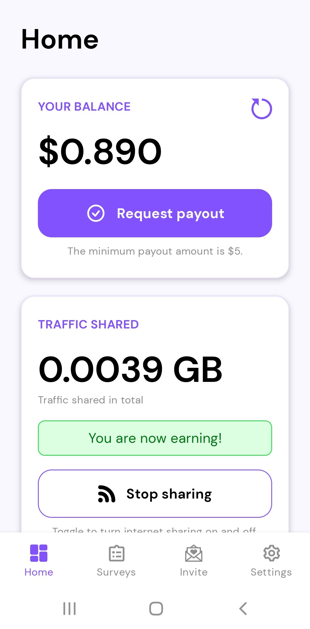 6시간 후 확인해보니 0.0039 GB 트래픽을 공유했습니다. 현재 Survey로 $0.89 수익중입니다. 추후 $5 초과 시 수익 인출이 가능한지 업데이트 하도록 하겠습니다.
