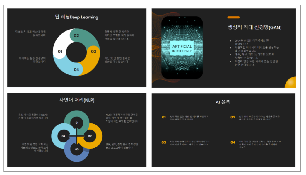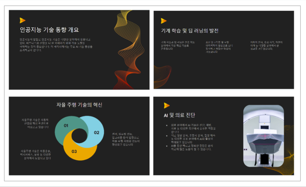 2) 슬라이드 생성을 선택하면 다음과 같은 슬라이드가 생성되었습니다. 생성된 슬라이드를 사용자가 검토, 수정하면 완성도 높은 슬라이드를 효율적으로 생성할 수 있습니다.