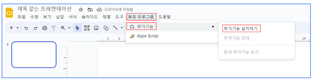 1) 먼저 구글 Slide의 부가기능에서 부가기능 설치하기를 선택합니다.