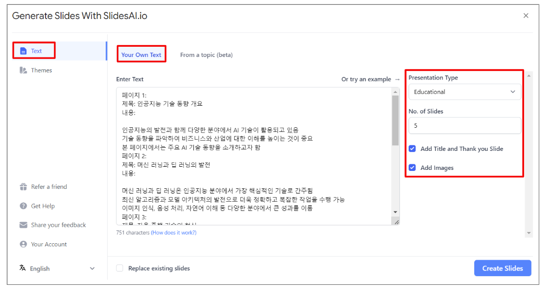 3) Text에서 Your Own Text 아래 입력창에 챗 GPT에서 생성한 내용을 입력합니다. 그리고 발표 형태, 슬라이드 장수, 타이틀 및 감사 페이지 삽입 여부, 이미지 삽입 여부를 선택합니다.