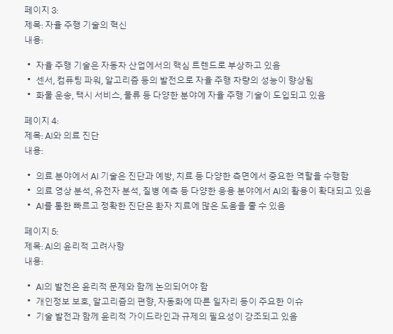 1) 챗GPT에서 AI 트렌드에 대한 PPT 내용을 아래와 같이 생성하였습니다.
