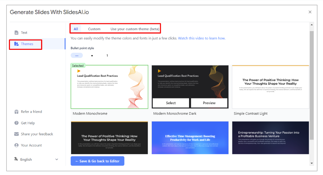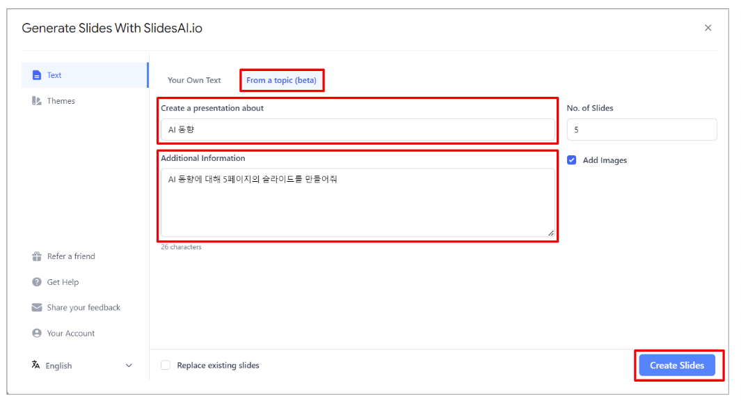 1) Text에서 From a topic 아래 입력창에 주제, 부가 정보를 입력합니다. 그리고 테마를 선택한뒤 Create Slides를 선택합니다.