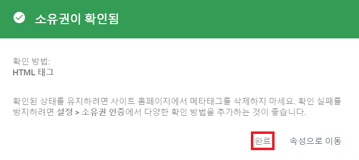 그러면 소유권 확인이 되면 다음과 같은 확인 완료 창이 나옵니다.