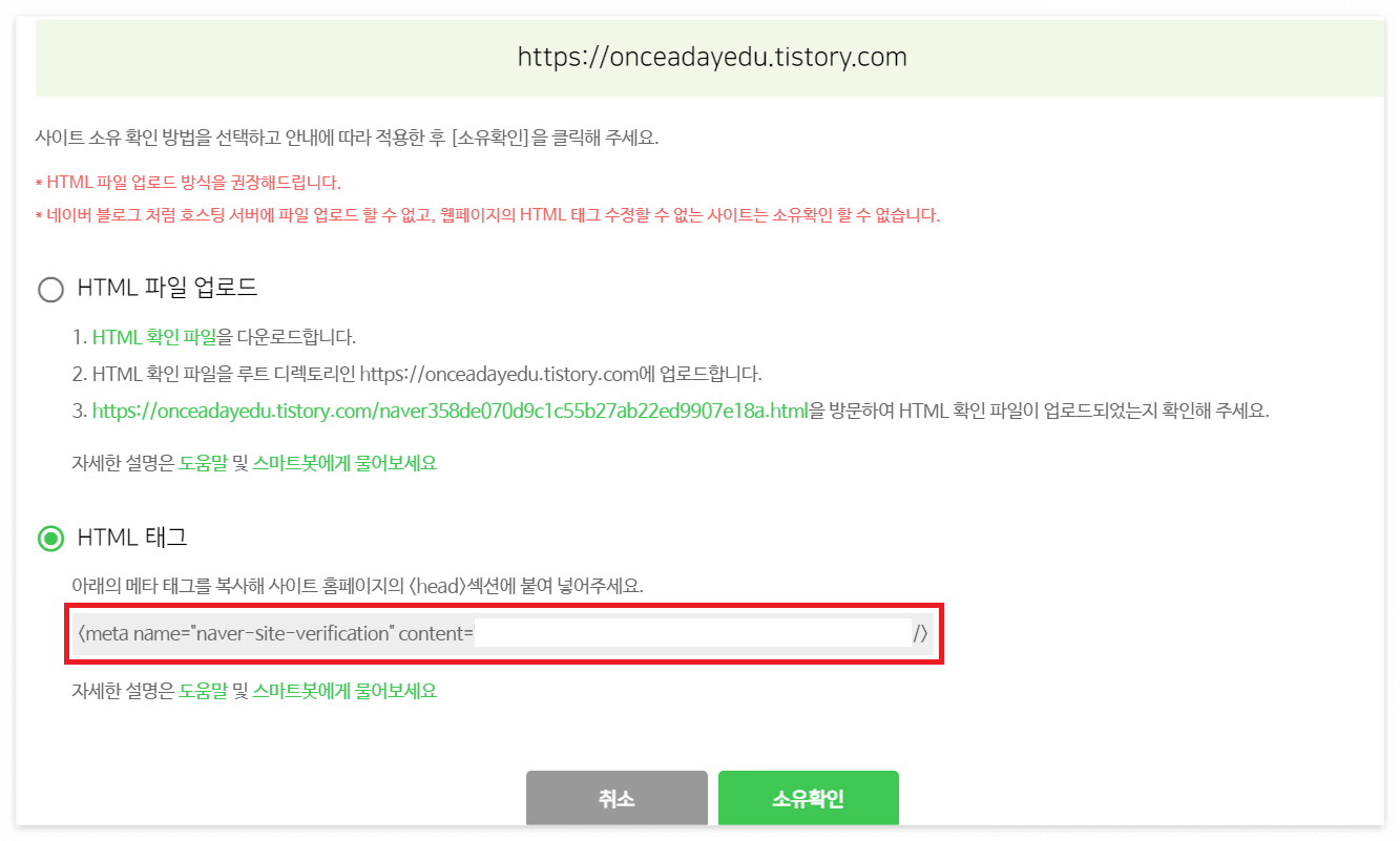 사이트를 등록하면 사이트 소유 확인을 해야합니다. HTML 태그를 선택하고 메타 태그를 복사합니다. <주의 사항!!!> 아직 소유 확인을 선택하면 안됩니다.