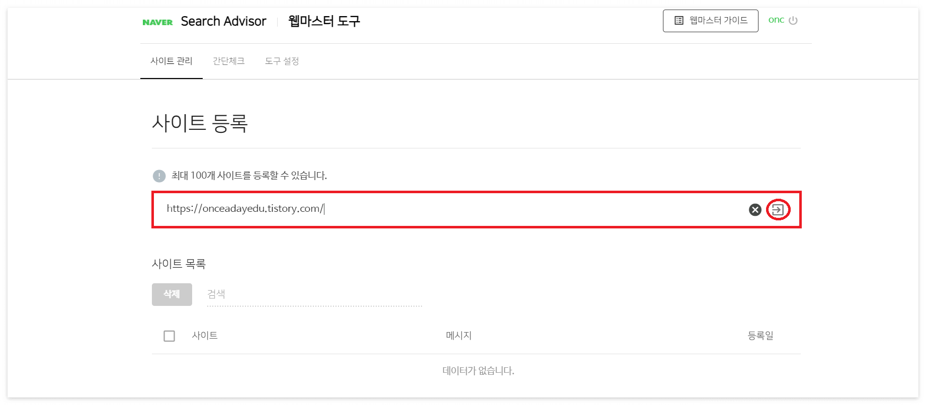 아래 네이버 서치어드바이저 링크에 접속해서, 상단의 웹마스터 도구를 선택합니다. 사이트 등록에서 내 티스토리 블로그 주소를 입력하고 화살표 버튼을 선택합니다.