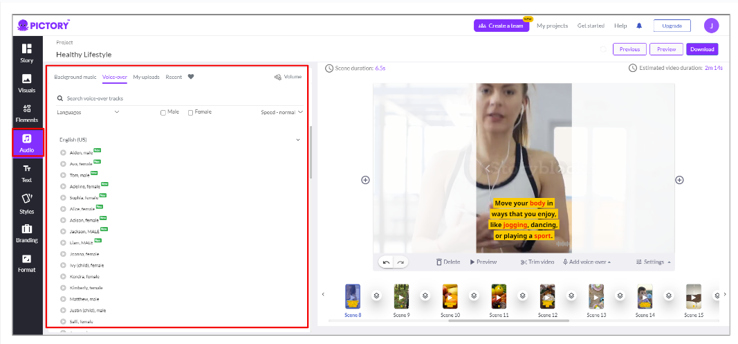 6) 음성을 설정해줍니다. 성별, 나이, 국적 등에 따라 여러 종류의 음성을 설정할 수 있습니다. 아쉬운 점은 아직 한글을 지원하지는 않습니다.