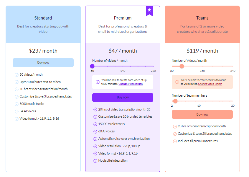 픽토리는 영상을 쉽게 만들고 편집할 수 있는 영상 제작 AI입니다. 비디오 편집, 디자인 기술 없이 스크립트, 웹페이지 등에서 바로 영상을 제작할 수 있으며, 비디오 편집 또한 채팅 기반으로 가능합니다. 또한 하이라이트 영상을 자동으로 생성해주고, 자동으로 비디오 자막을 생성해줍니다. 픽토리는 영상 3개까지 무료로 제작해볼 수 있습니다. 유료의 경우 표준 월 $23, 프리미엄 월 $47불의 요금제로 이용하실 수 있습니다.