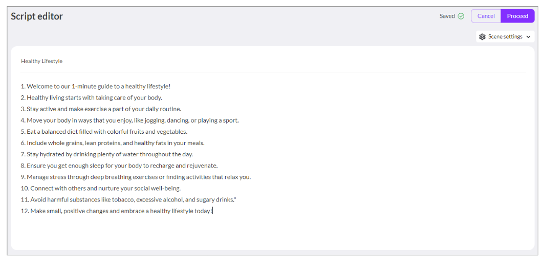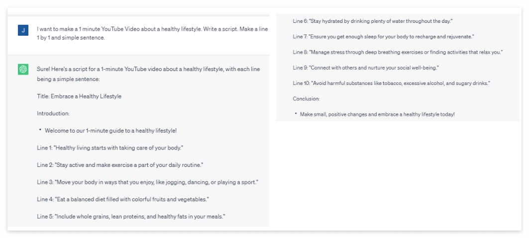 동영상을 만들기 위해 먼저 챗GPT에게 건강한 삶에 대해 1분짜리 유투브 영상의 스크립트를 생성해달라고 요청하였습니다. 챗GPT가 생성한 유투브 스크립트는 다음과 같습니다.