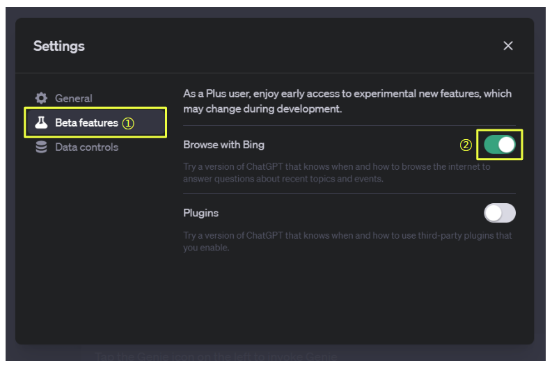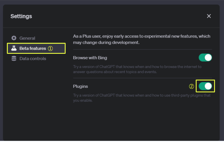 1) Settings 창에서 나타나면, 왼쪽 메뉴에서 Beta features선택합니다. 그 다음 Plugins를 활성화합니다.