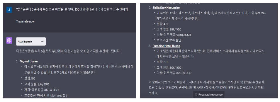 웹브라우징 기능은 최신 정보를 반영하지 못한 단점은 보완이 되나 아직 웹정보를 읽는데 시간이 많이 소요되고 실패가 일어나는 단점이 있어 보완이 필요해보입니다. 플러그인의 경우 우선 여행 관련 익스피디아, 카약 플러그인을 설치하고 이용해 보았습니다. 현재 약 600여개의 플러그인을 사용할 수 있습니다. 다른 유용한 플러그인 관련 아래 포스팅도 참고 부탁드립니다.