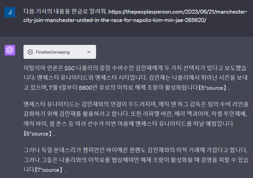 챗GPT가 Bing 브라우저와 연계되어, 인터넷 웹페이지 정보의 요청 및 요약 할 수 있고, 특정 웹사이트를 찾아달라고 요청할 수 있습니다.