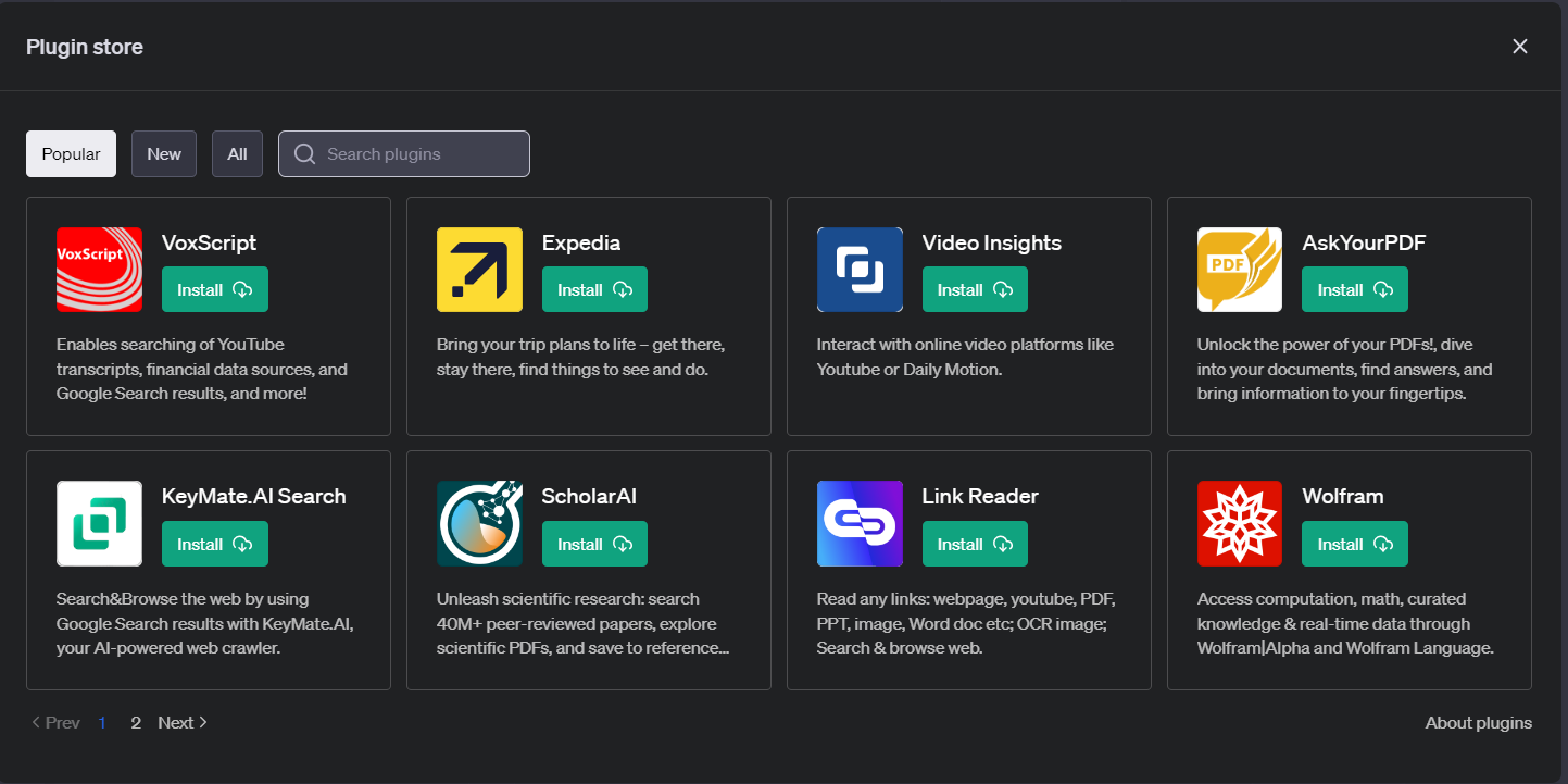 챗GPT에 사용자가 필요한 플러그인을 적용하여 사용할 수 있게 되었습니다. 이제 ChatGPT를 다양한 외부 서비스와 연계가 시작됨으로써, 더 편리하게 활용할 수 있게 되었습니다. 현재 600여개의 플러그인을 사용하실 수 있습니다.