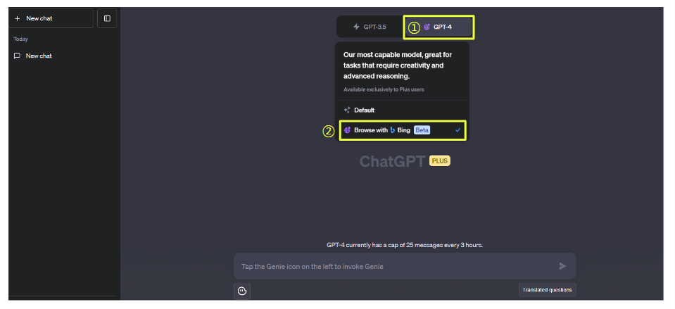 3) 챗GPT 메인화면에서 상단의 GPT4 선택을 하시고, Browse with Bing을 선택합니다.