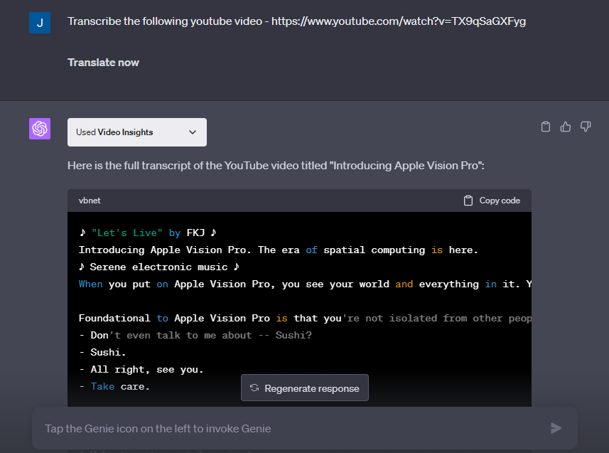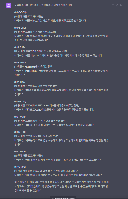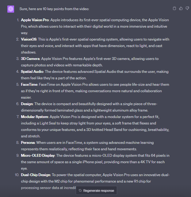 챗GPT에서 설치한 Video Insight를 활성화하고, 입력창에 다음과 같이 입력합니다. 영상은 아래 애플 비전 프로 공식 소개 영상을 활용하였습니다.