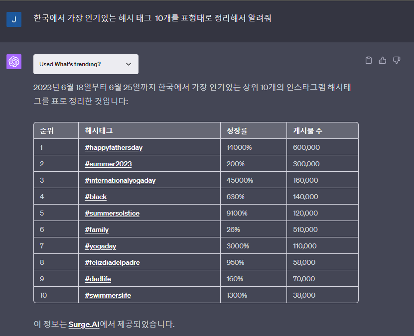 이상으로 What's trending 설치 및 사용 방법에 대해 알아보았습니다. 챗GPT에서 What's trending 플러그인을 활용하여 간단하게 검색어, 해쉬태크 키워드 분석을 할 수 있게 되어 매우 편리한 것 같습니다. 키워드, 해쉬태크 트랜드 분석 결과가 컨텐츠, 블로그 아이디어에를 도출하는데 유용하게 사용될 수 있을 것 같습니다.