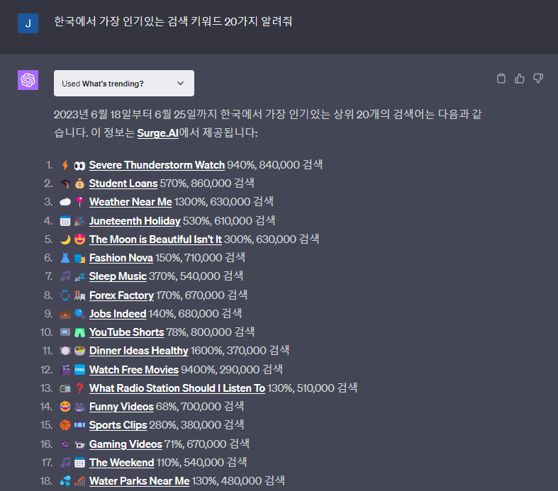1) "한국에서 가장 인기있는 검색 키워드 20가지 알려줘"에 대한 결과는 아래와 같습니다. 6월 22일까지 학자금 대출 마감이어서 학자금 대출이 2위였고, 여름이어서 워터파크 관련 검색이 19위였습니다.