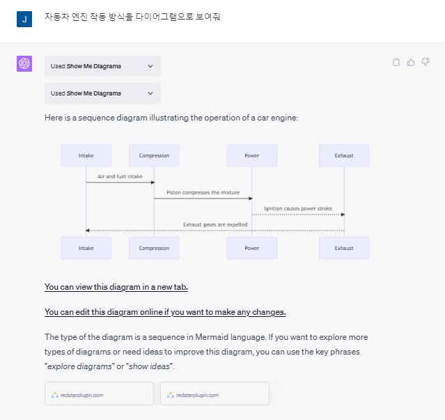 2) "자동차 엔진 작동 방식을 다이어그램으로 보여줘"에 대한 결과는 다음과 같습니다.