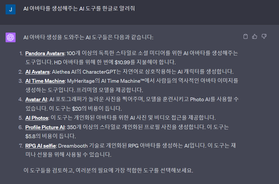 2) AI 아바타를 생성하는 AI 도구에 대한 요청 결과는 다음과 같습니다.