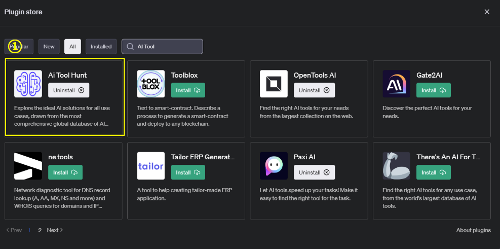 챗GPT 플러그인 스토어(Plugin Store)에서 AI Tool Hunt를 검색하고 설치합니다. AI Tool Hunt 외에도 필요한 AI 도구를 검색해주는 플러그인으로 Open Tools AI, Paxi AI 등이 있습니다.