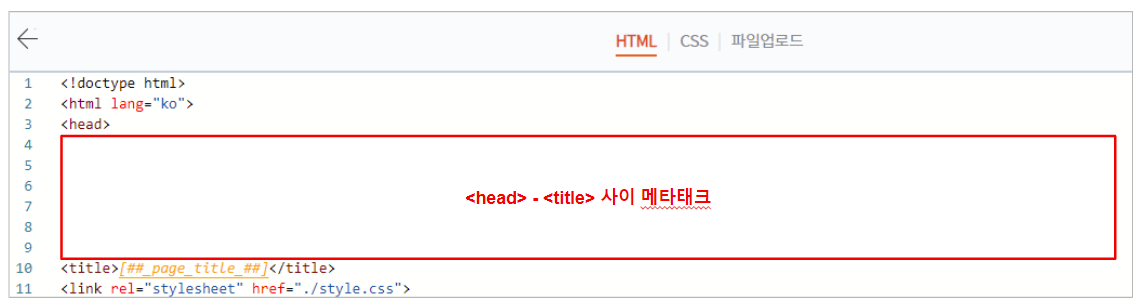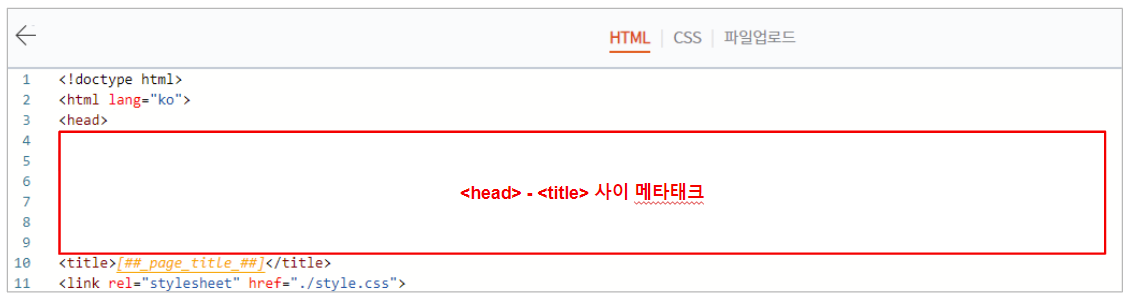 1) [관리자] → [스킨편집] → [html편집]에 들어가서, 따로 저장해두었던 기존 스킨 메타 태그를 <head> - <title> 사이에 붙여 넣기 합니다.